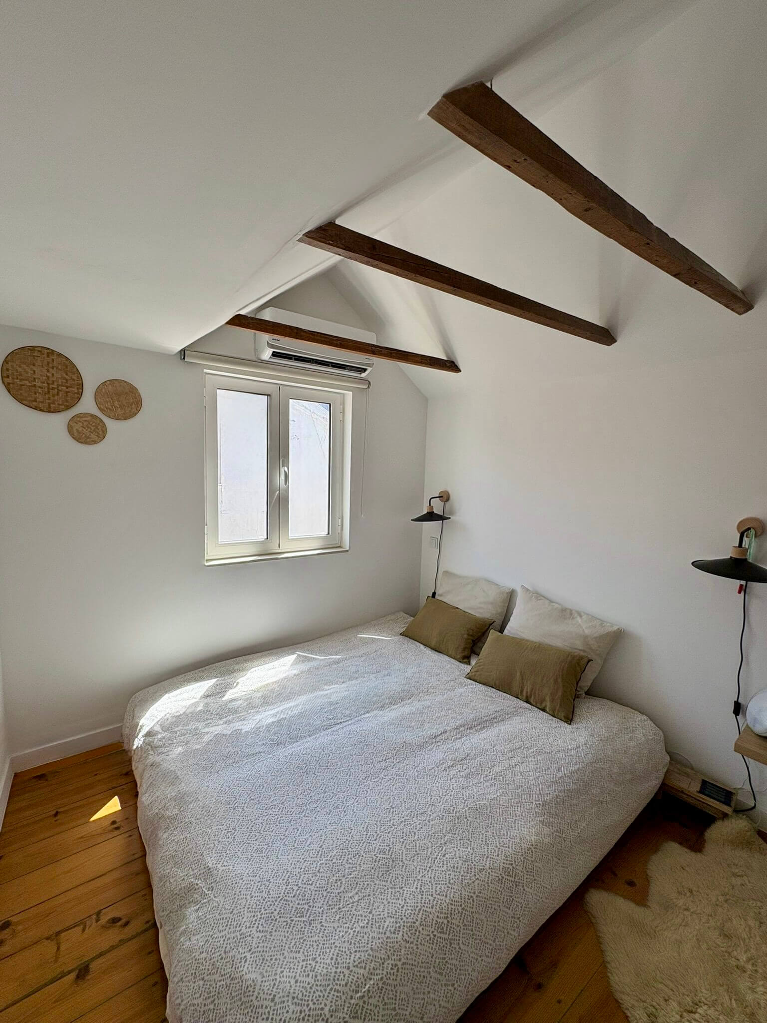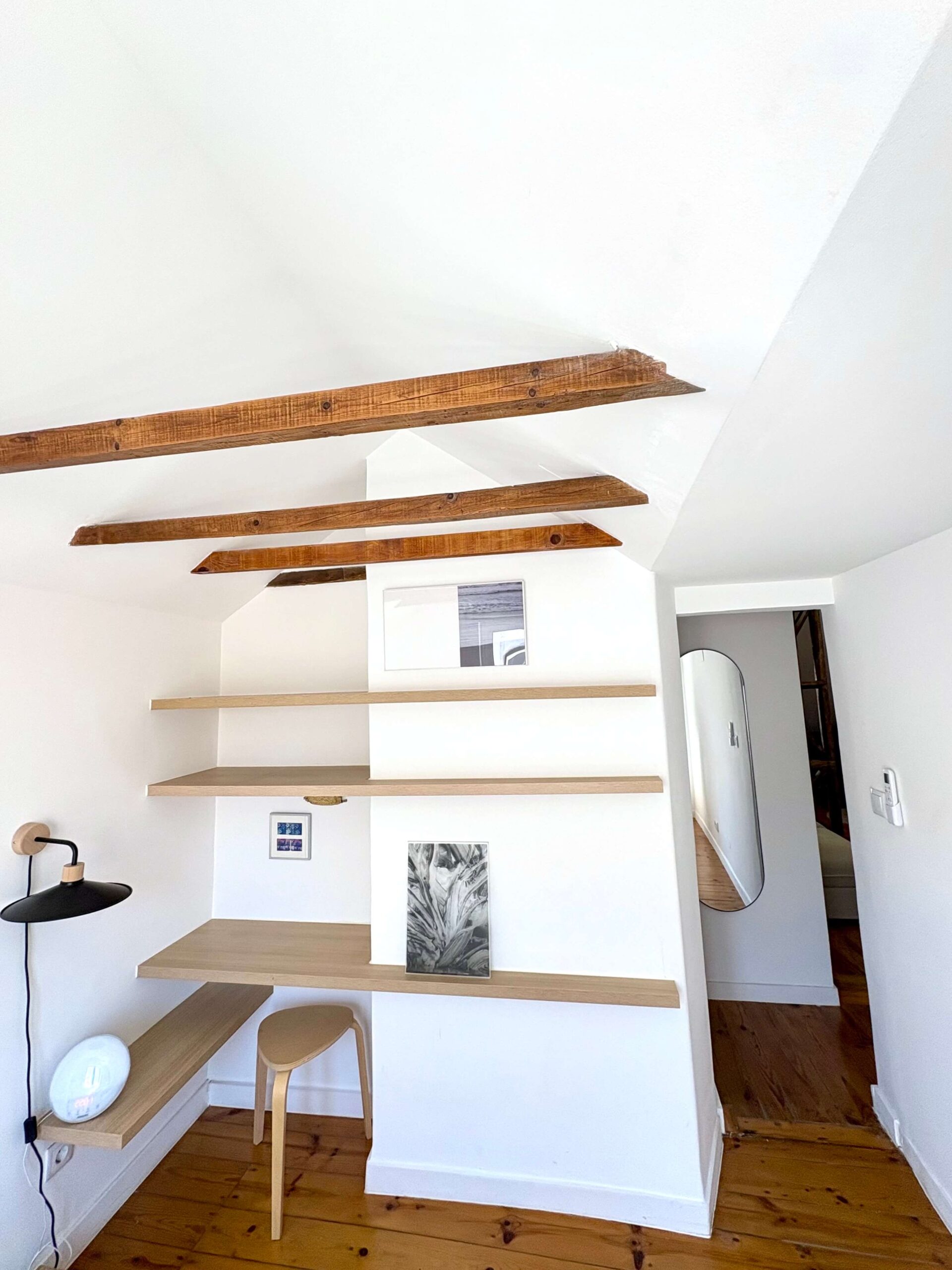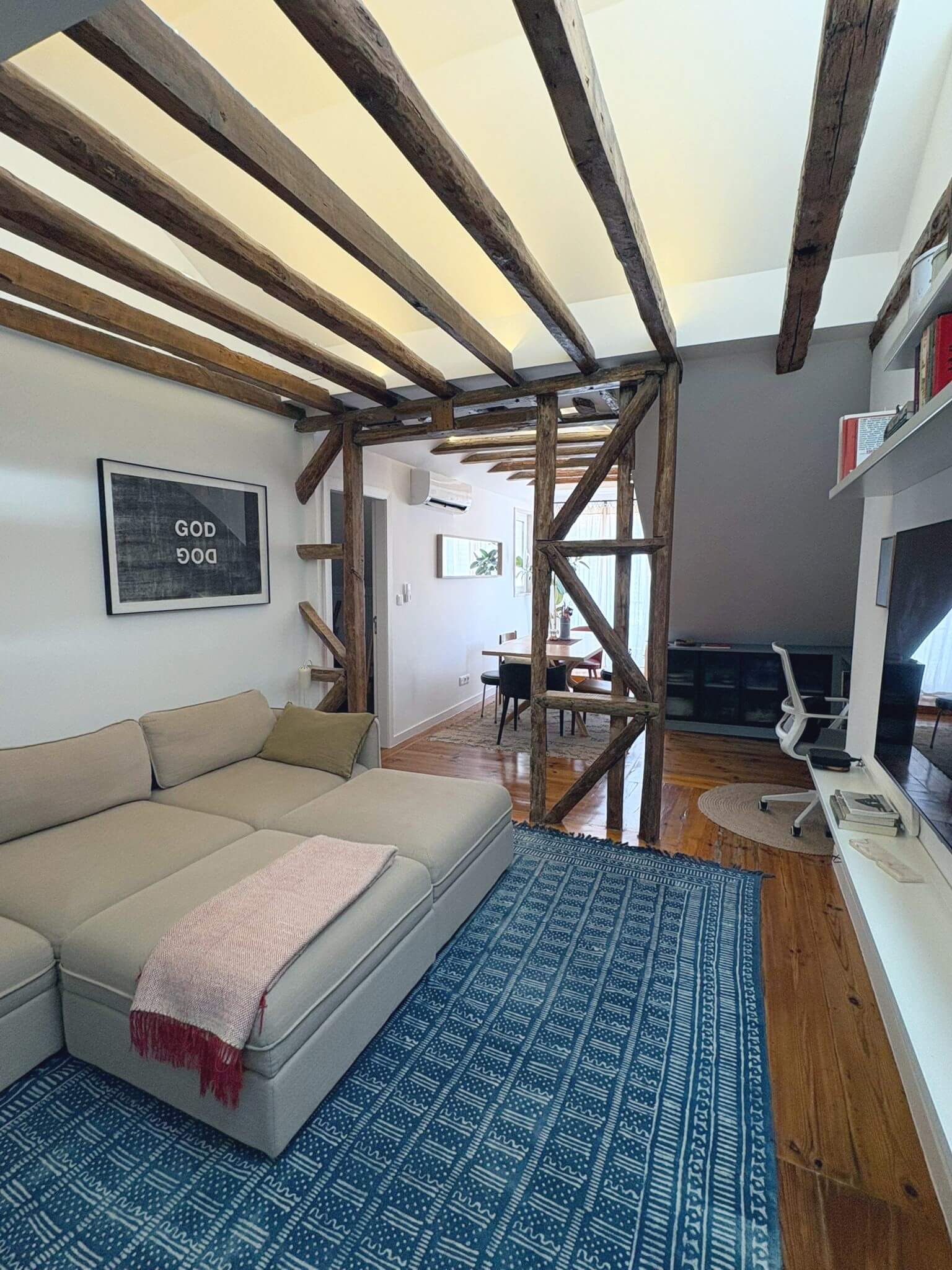 The beautiful loft showcases exposed wooden beam architecture with high ceilings and hardwood floors. Natural light flows through skylight windows throughout the day and the integrated work space makes it perfect for both relaxation and productivity.